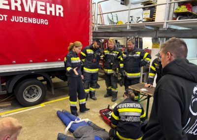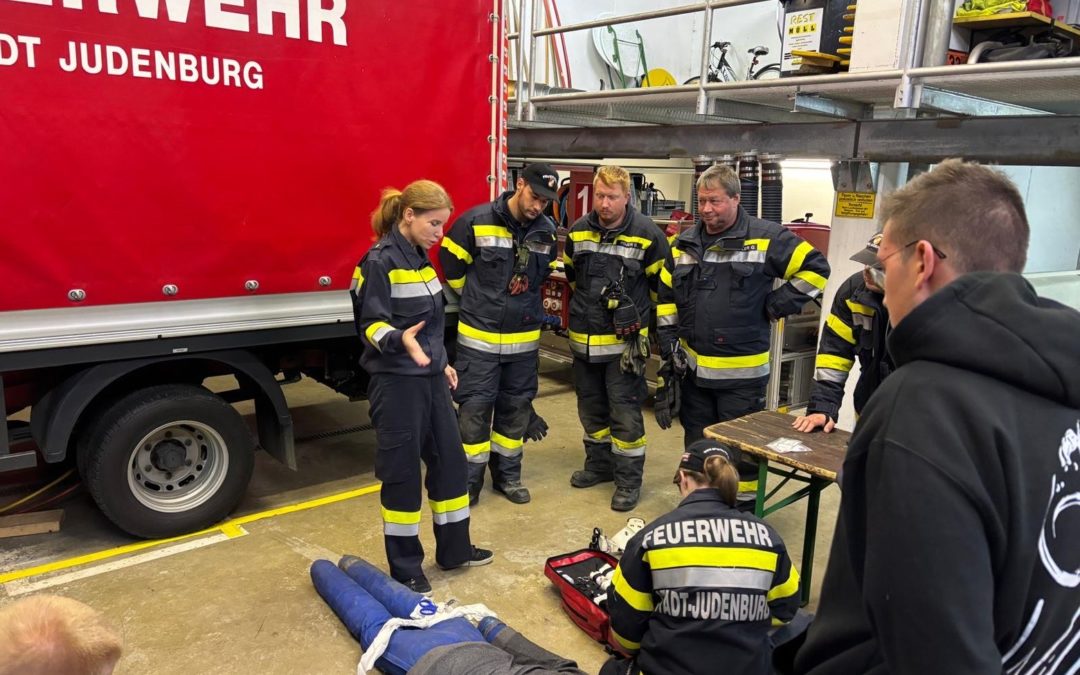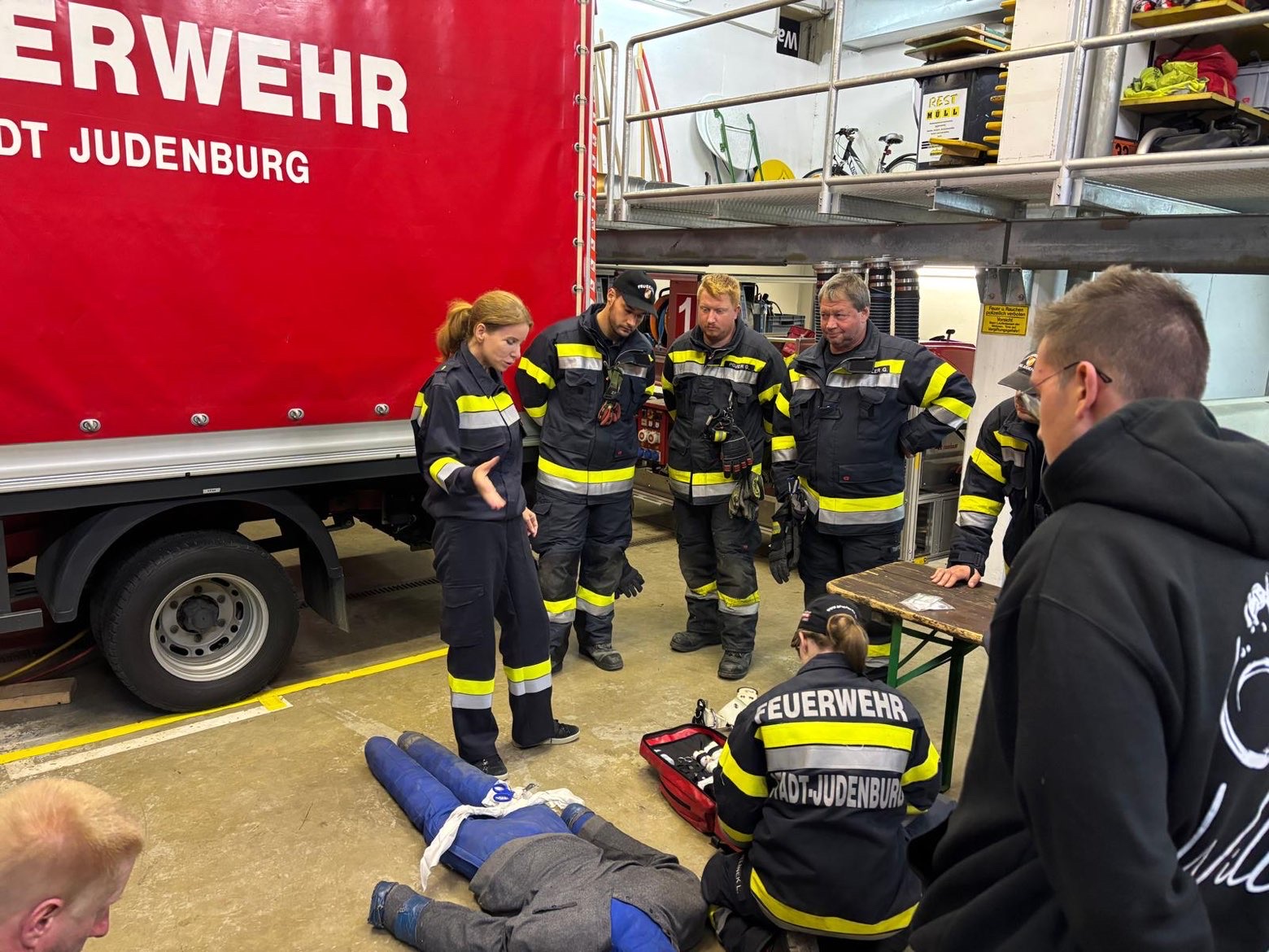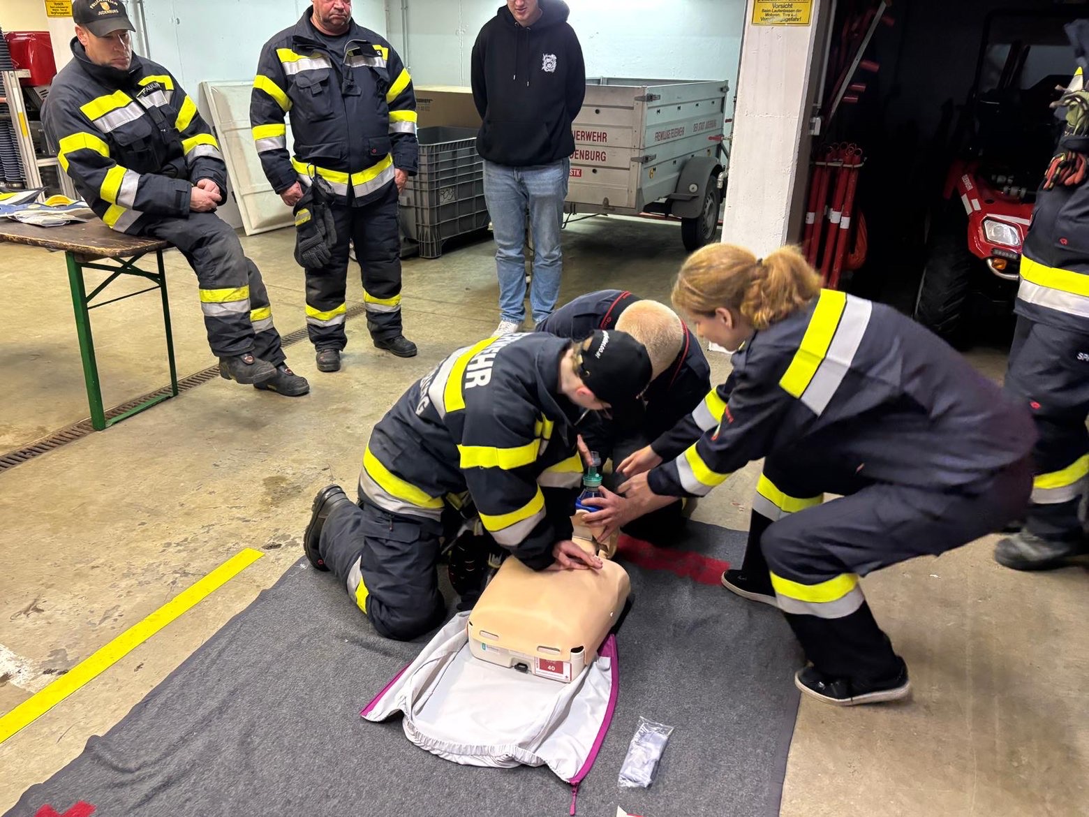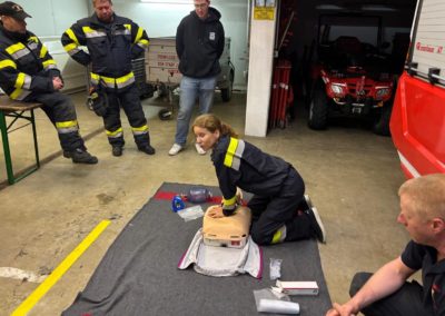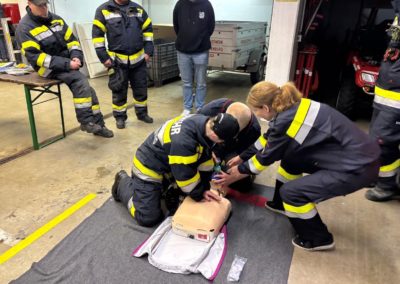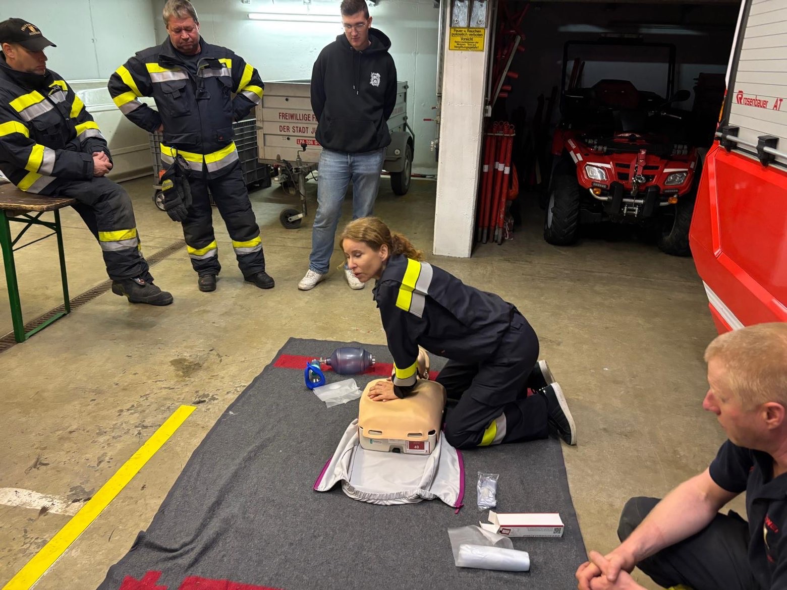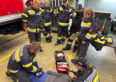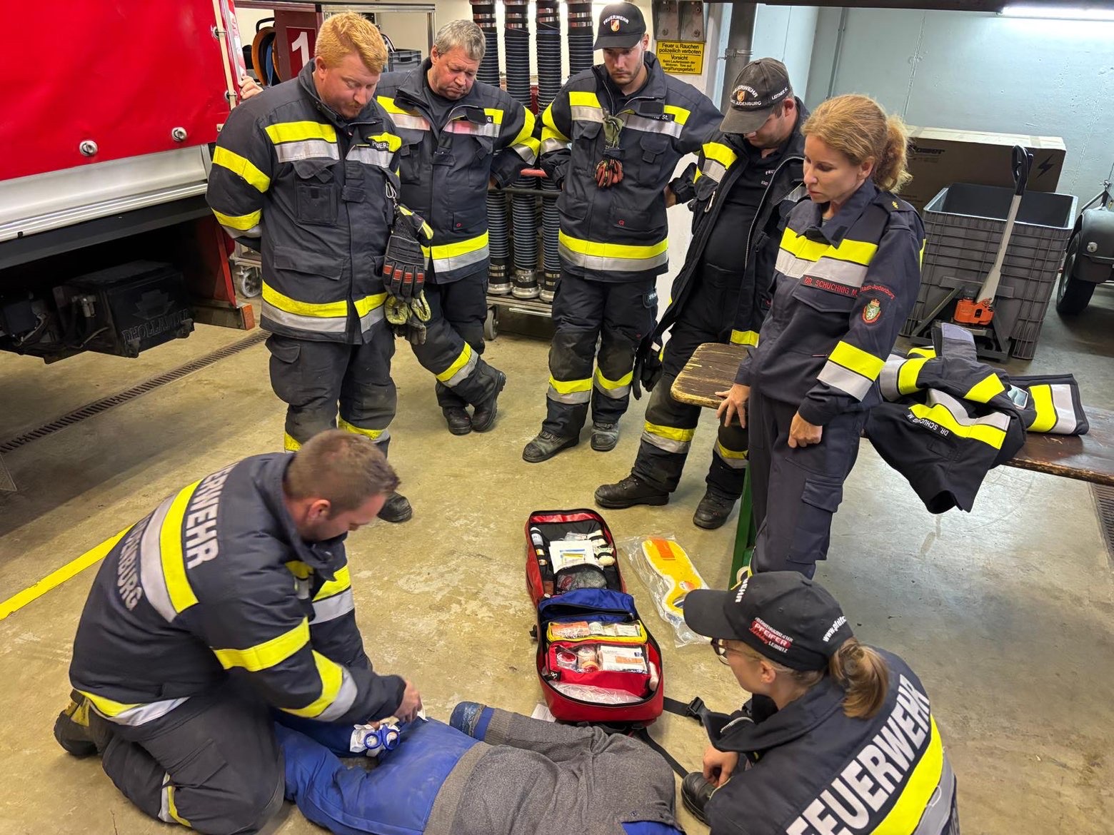 Am vergangenen Freitag, den 24. Oktober 2025, führten wir leitend mit unserer Feuerwehrärztin Frau Dr. Schuchnigg eine Erste Hilfe Übung durch. Übungsannahme: eine verletzte Person unbestimmten Grades unter Räder eines Fahrzeuges. Nachdem kein offensichtlicher Puls oder Atmung festgestellt werden konnte, wurde während der gesamten Zeit der Befreiung der verletzten Person Reanimationsmaßnahmen durchgeführt. Nachdem die Person mittels Hebekissen befreit werden konnte, wurde die Wundversorgung gleichzeitig mit anhaltenden Reanimationsmaßnahmen ausgeführt. Nach Besprechung des Inhaltes unserer Sanitätsrucksäcke wurde praktisch weiter an der Reanimationspuppe der Herz-Kreislauf-Stillstand beübt.