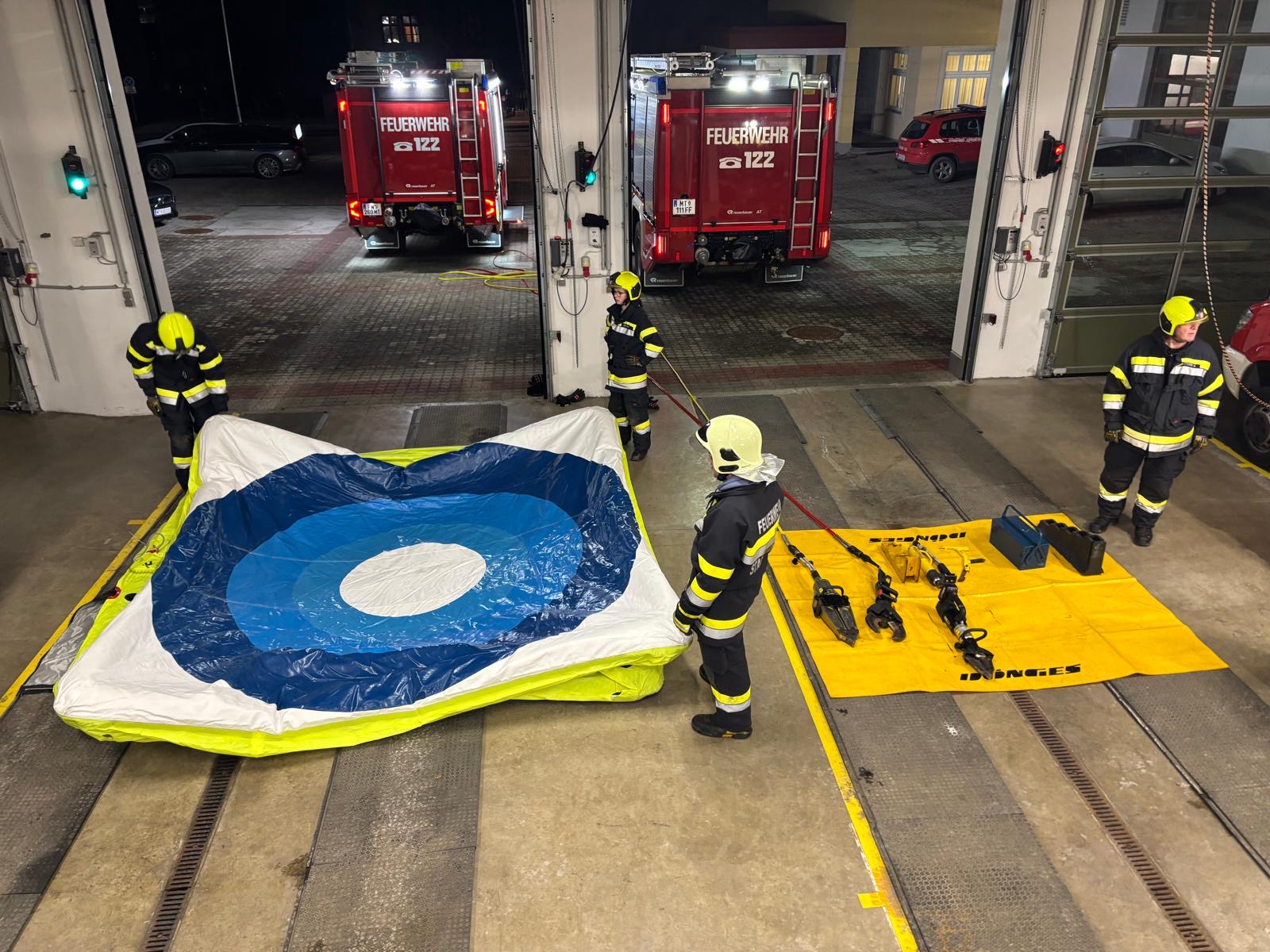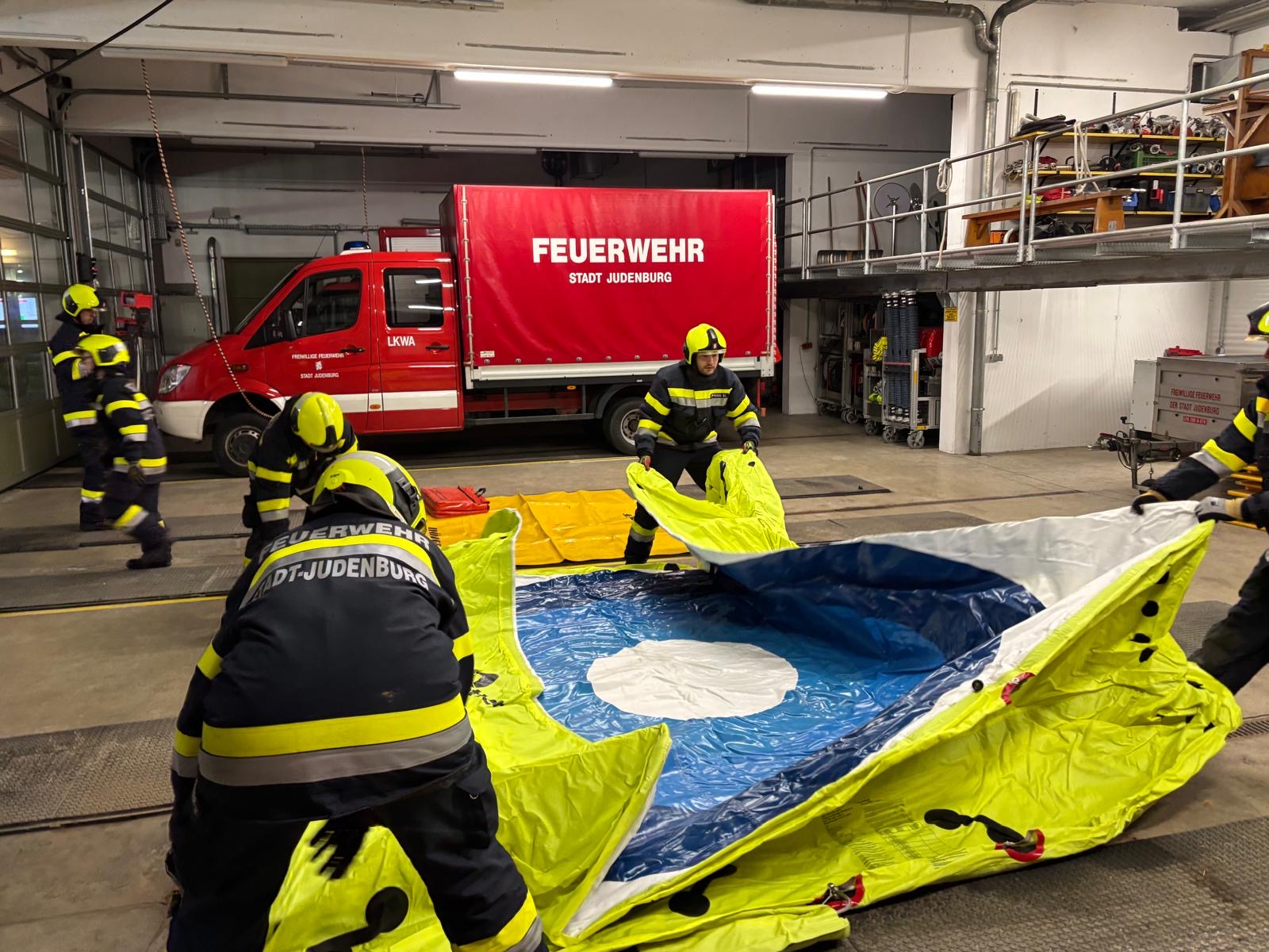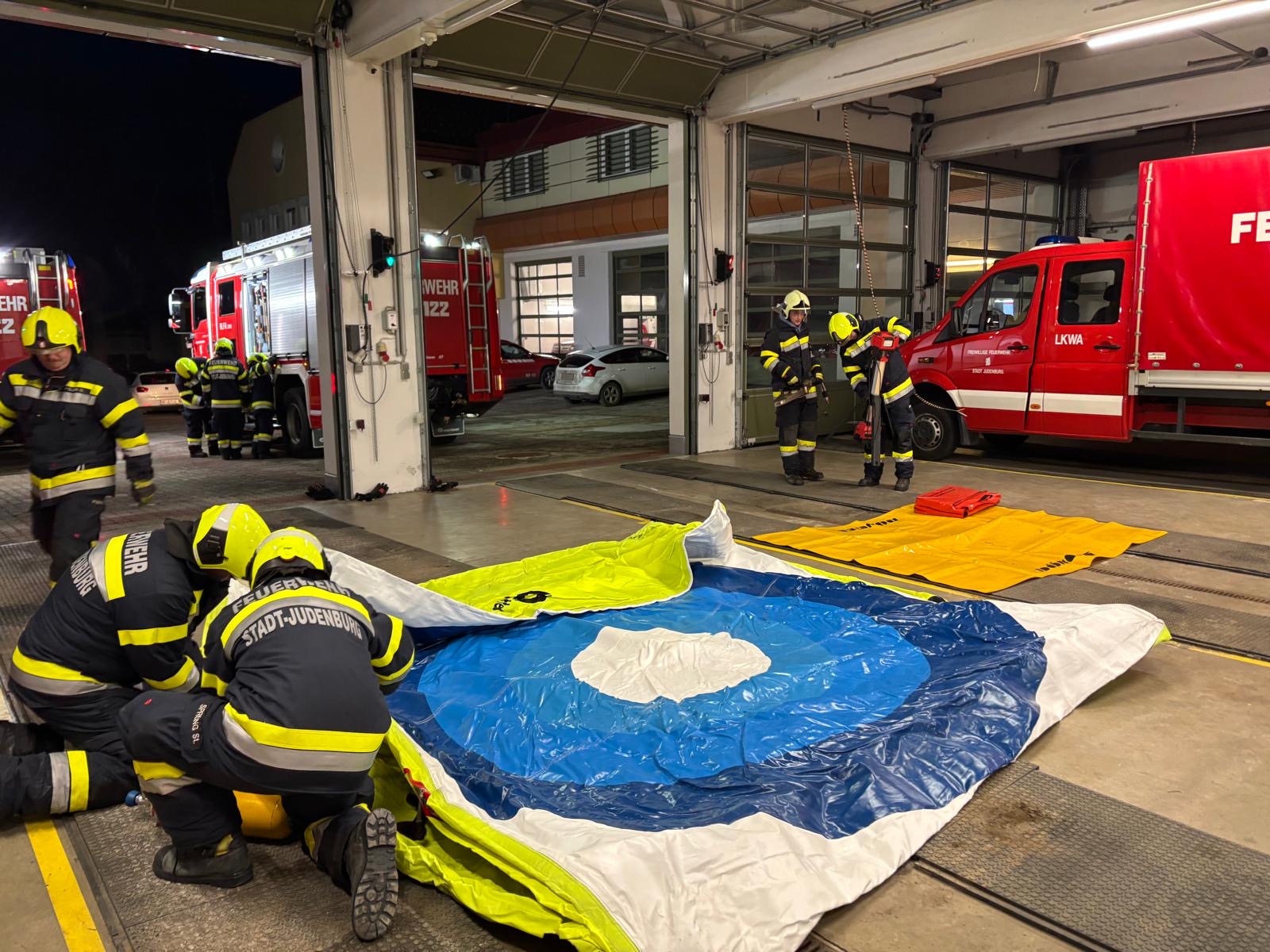 Bei der heutigen Gesamtübung trat die Mannschaft in zwei Gruppen zu einem Parallelduell an. Aufgabe war es, den Sprungretter sowie den Bereitstellungsraum für einen T10 möglichst schnell und sauber aufzubauen.
